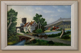 Was ist das Besondere daran? Ist es nicht Kitsch? Es ist doch keine Ansicht von Tremmen. Nein, sondern wahrscheinlich eine aus der früheren Heimat des Alois Breyer, aus Bessarabien (heute Moldau). 1945 landeten er und seine Familie als Kriegsflüchtlinge in Tremmen und wurden bei Familie Führer untergebracht. Hier verdingte sich der schon ältere Herr seinen Lebensunterhalt damit, dass er Uhren reparierte, Kochtöpfe lötete und Ölbilder malte, die er im Dorf verkaufte. Viele Leute hatten dann einen „Breyer“ über ihrem Ehebett oder im Wohnzimmer zu hängen. Diese Bilder konnte man sich nach dem Krieg leisten, wenn man sich eine Wohnung einrichtete. Leider sind seine Bilder inzwischen weitgehend verschollen. Weiteres dazu erfahren Sie in der neuen Sonderausstellung.