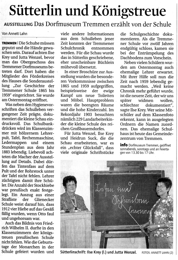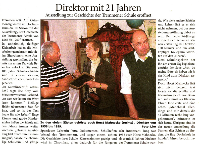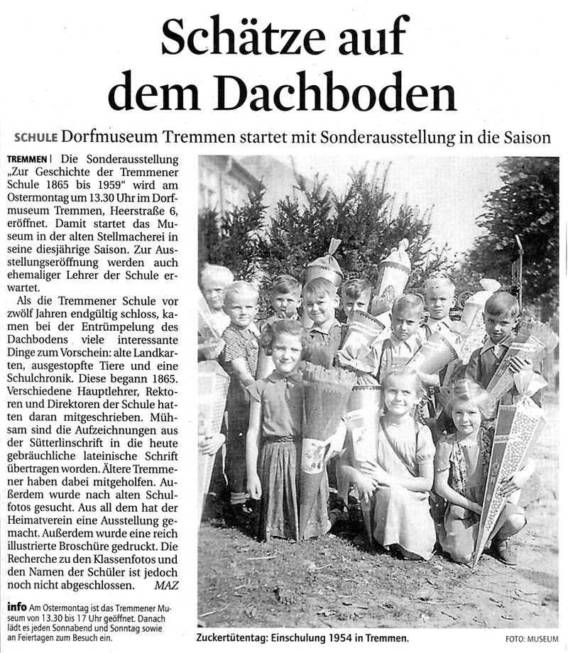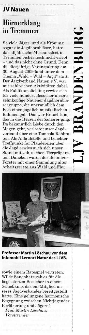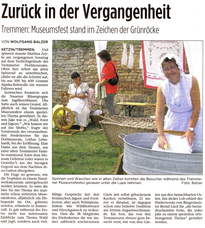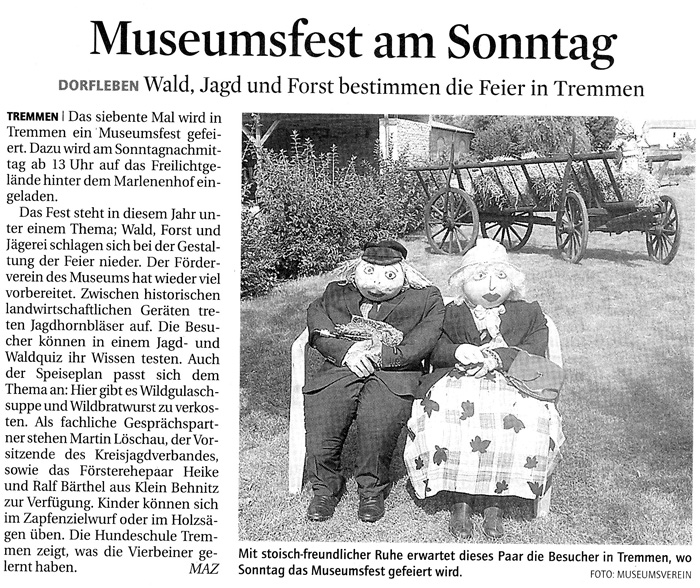MAZ, 09. April 2009 “Schätze auf dem Dachboden” MAZ, 14. April 2009 “Sütterlin und Königstreue” Preußenspiegel, 22. April 2009 “Direktor mit 21 Jahren” BRAWO, 05. April 2009 In mühsamer Kleinarbeit MAZ, 26. August 2009 “Museumsfest am Sonntag” BRAWO, 06. September 2009 “Zurück in der Vergangenheit” WIRJäger, 11/2009, S. 5 “Hörnerklang in Tremmen”