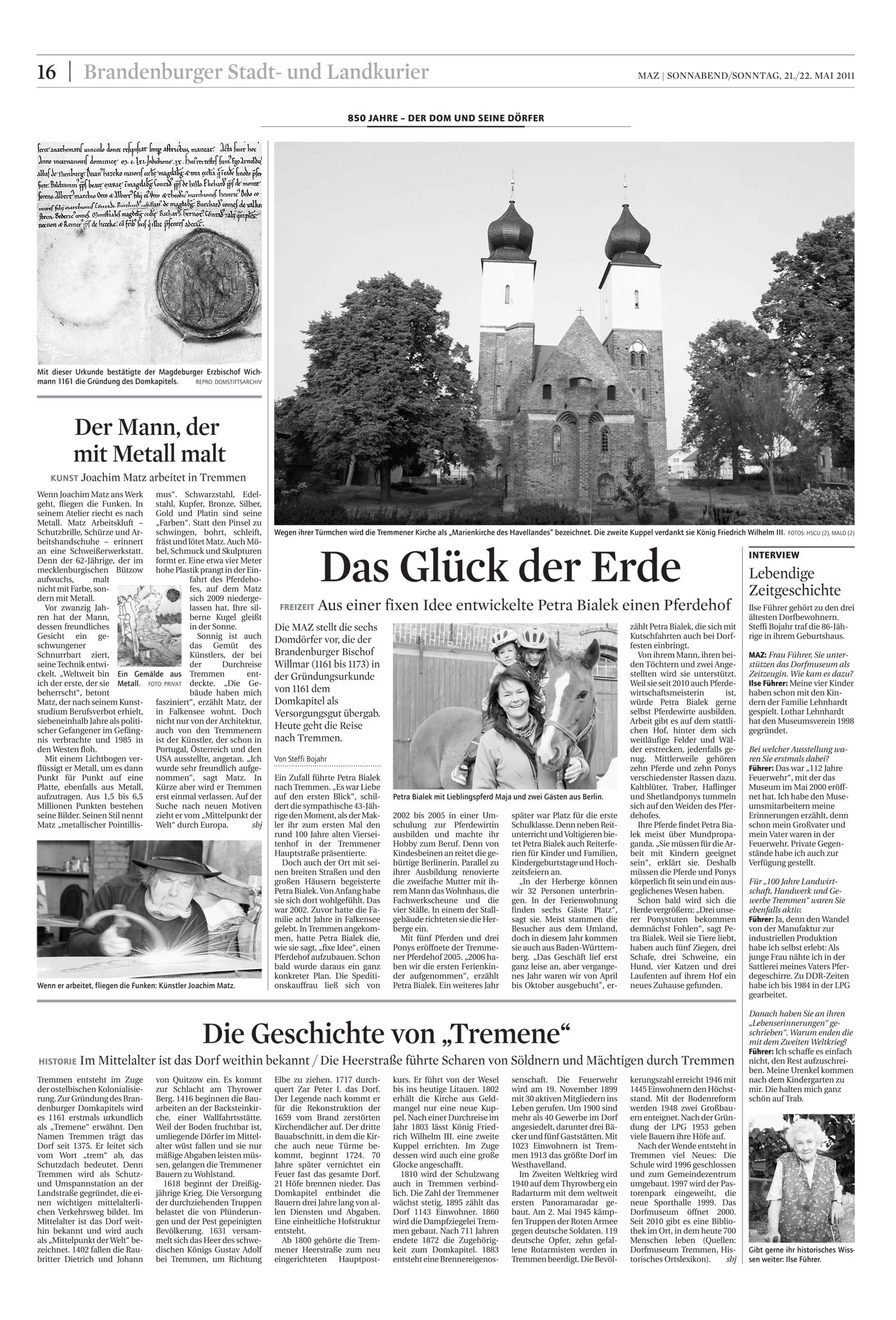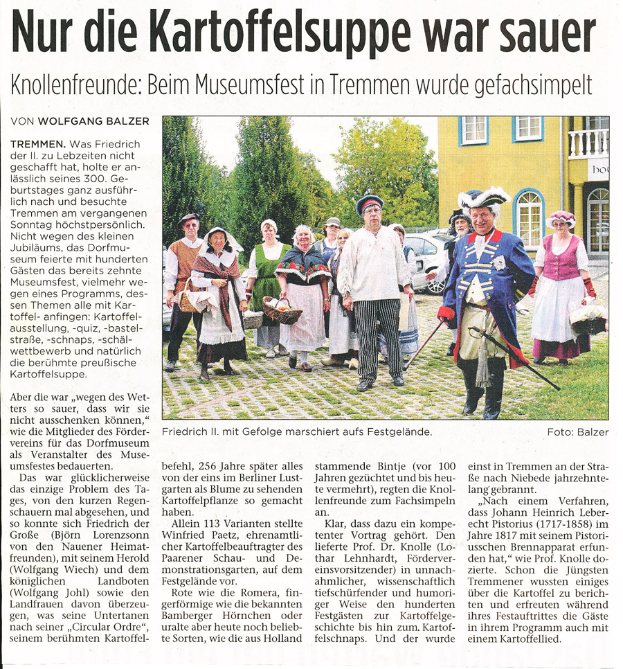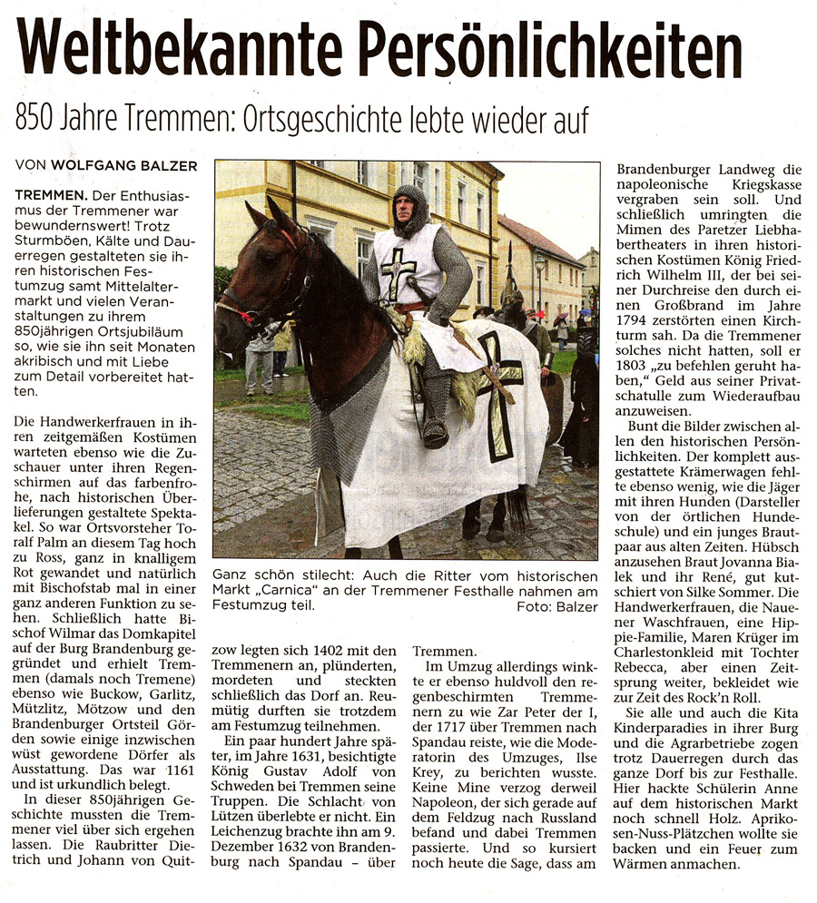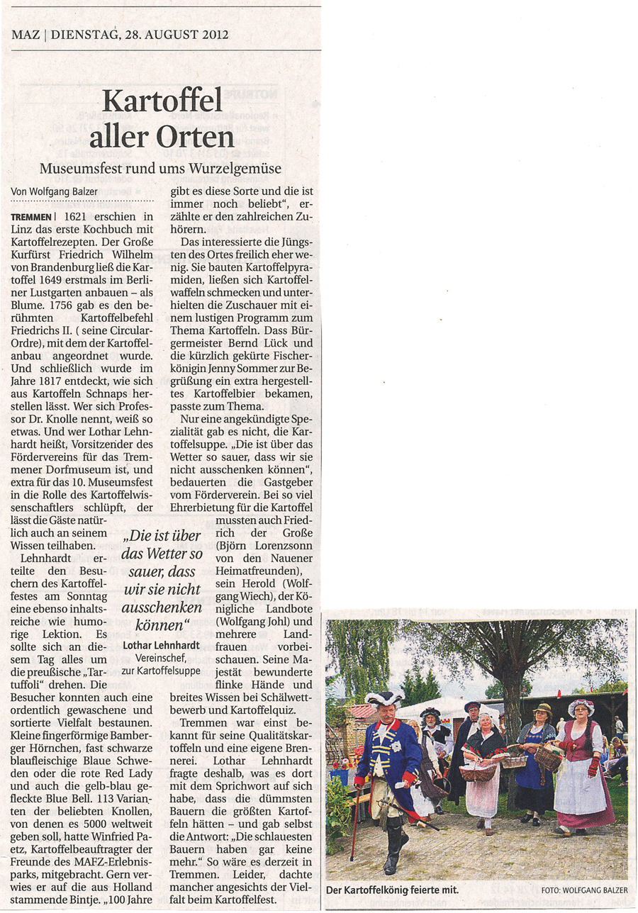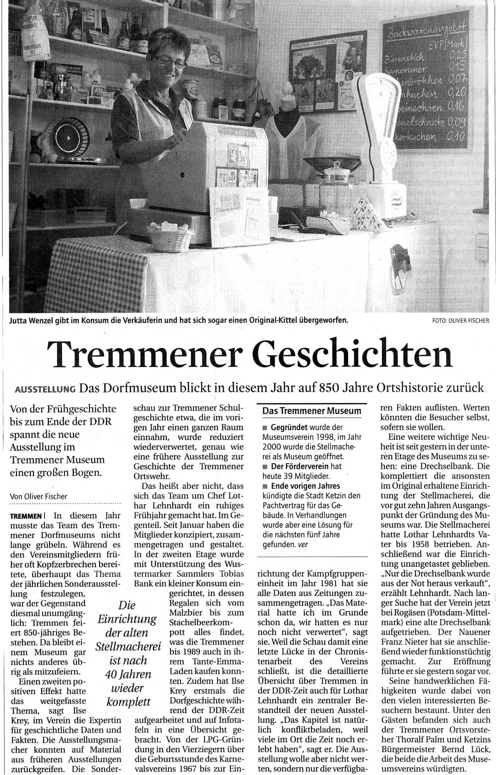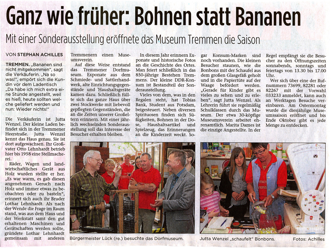MAZ, 26. April 2011 “Tremmener Geschichten” BRAWO 01. Mai 2011 “Ganz wie früher: Bohnen statt Bananen” MAZ, 30. August 2011 “Frische Torte und ein alter Helm” BRAWO, 04. September 2011 “112 – Mehr als nur eine Zahl” MAZ, 28. August 2012 “Kartoffel aller Orten” BRAWO, 02. September 2012 “Nur die Kartoffelsuppe war sauer”