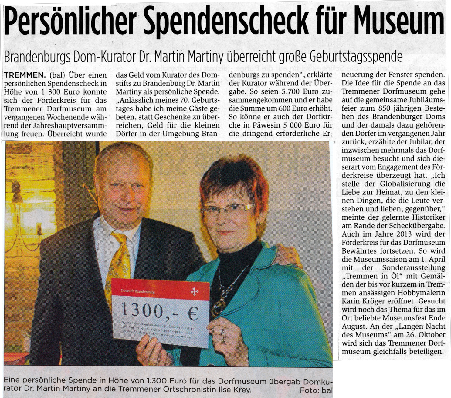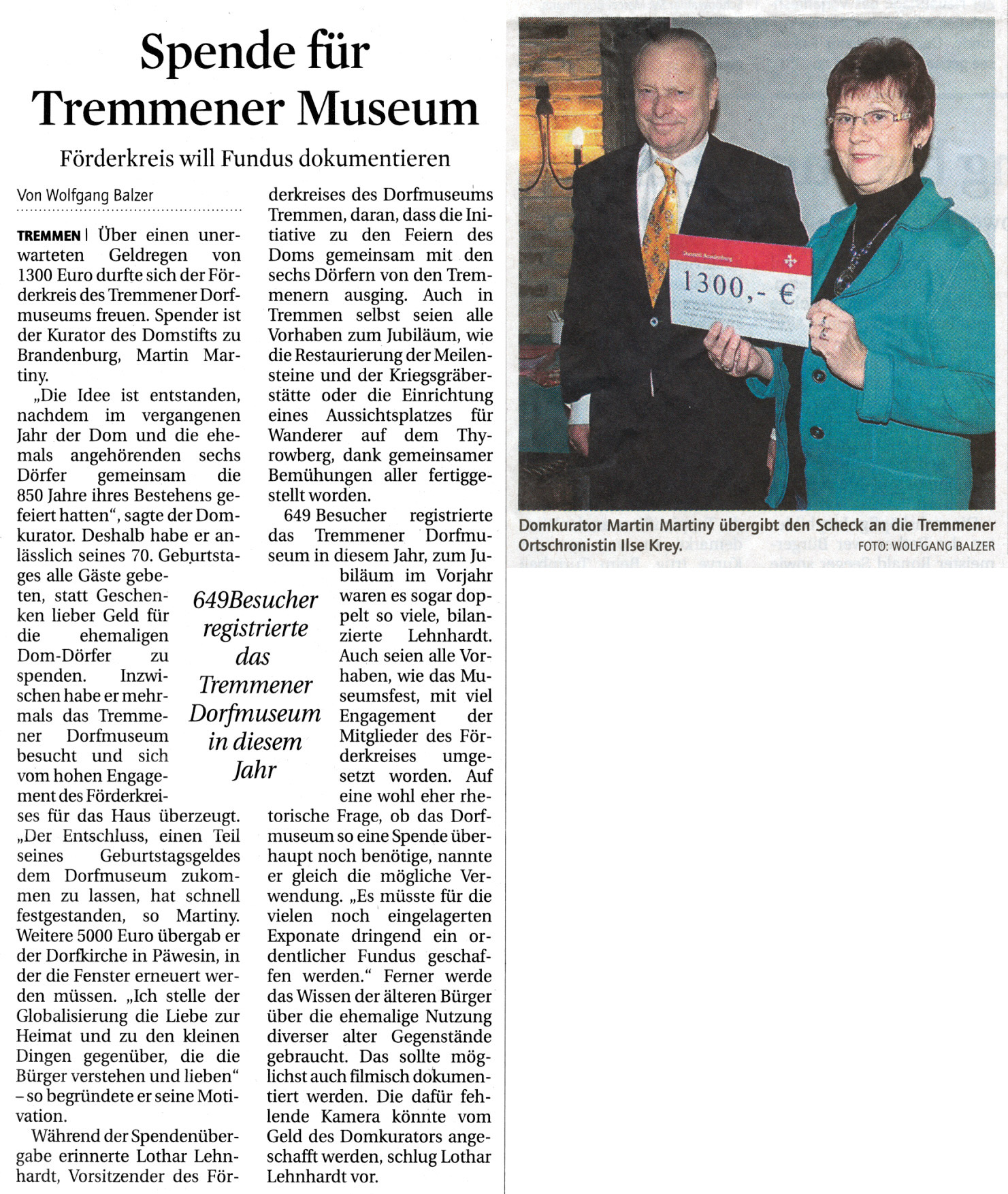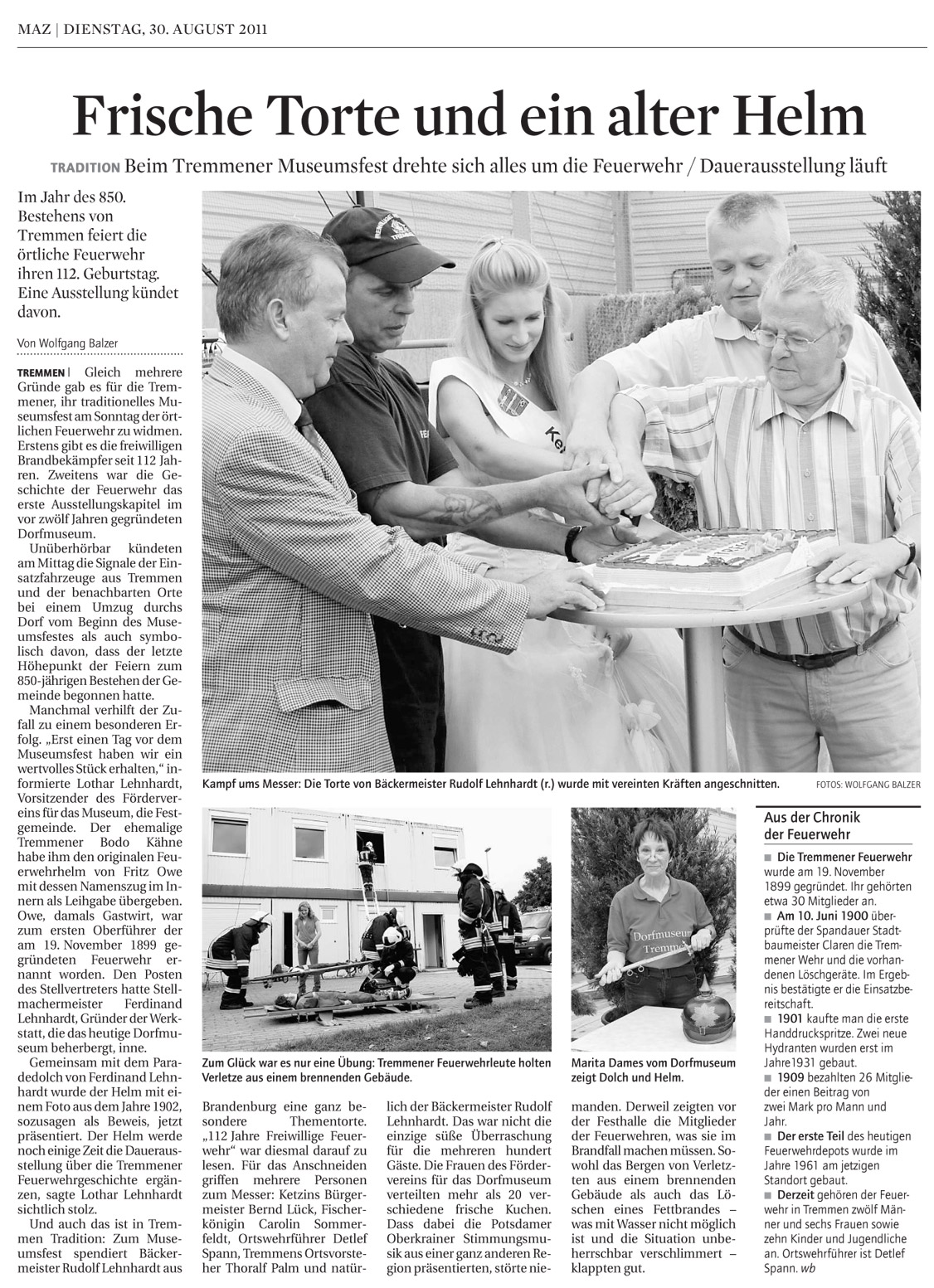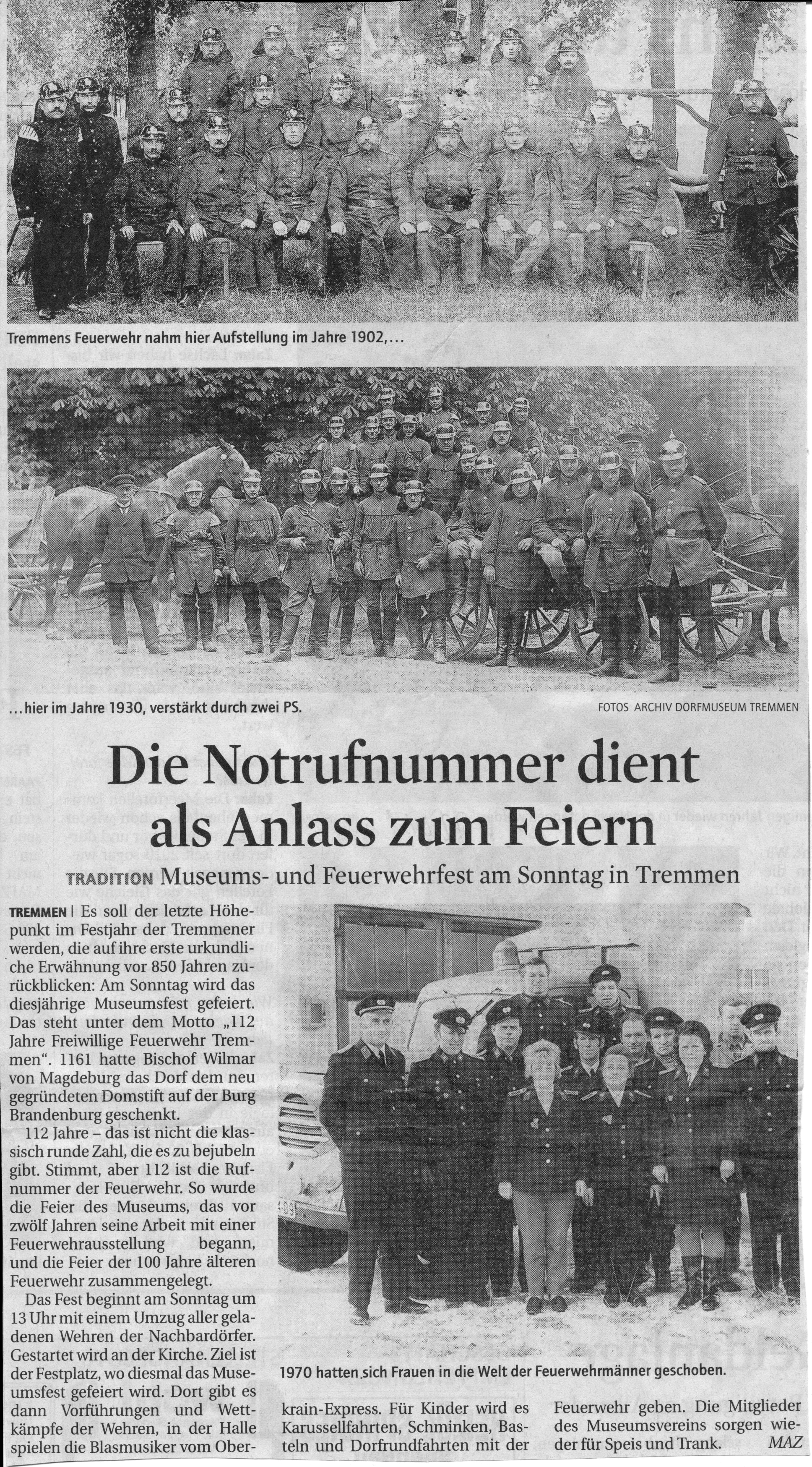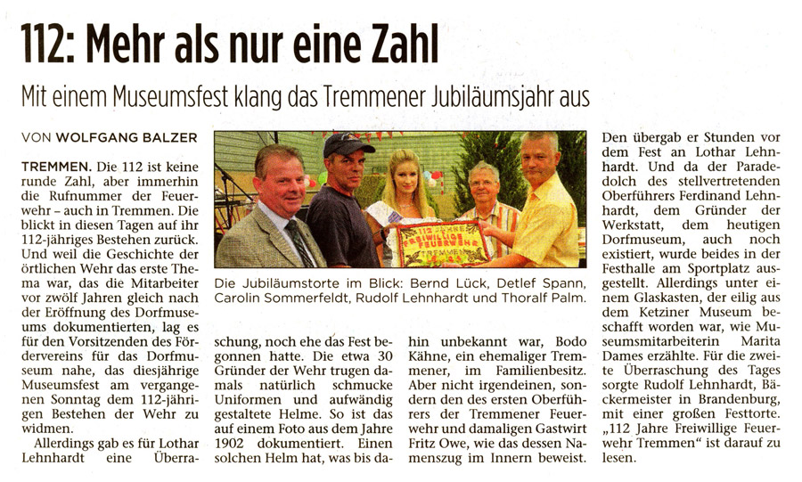 MAZ, 24. August 2011 “Die Notrufnummer dient als Anlass zum Feiern” MAZ, 12. Dezember 2012 “Spende für Tremmener Museum” BRAWO, 16. Dezember 2012 “Persönlicher Spendenscheck für Museum” früher Übersicht später früher Übersicht später MAZ, 21. Mai 2011 “Das Glück der Erde” BRAWO, 10. Juli 2011 “Weltbekannte Persönlichkeiten”